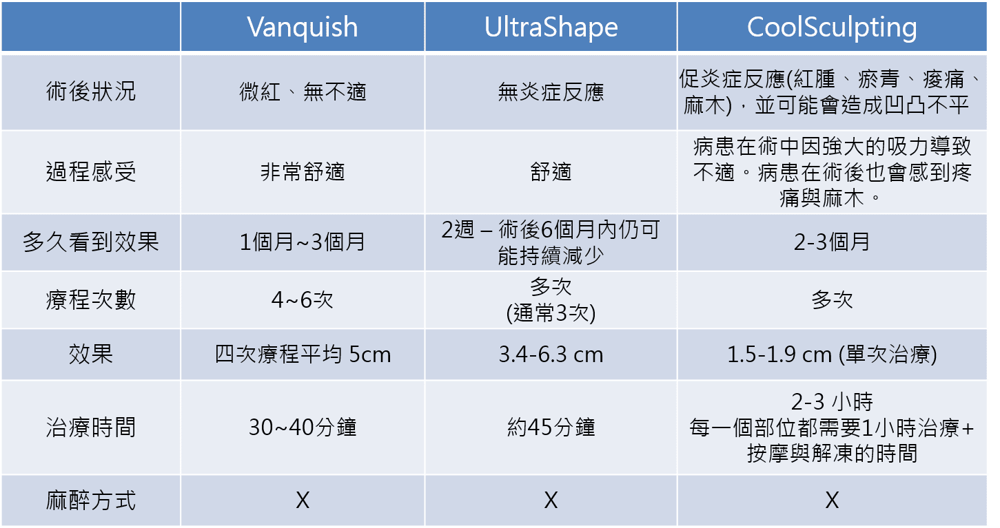 Vanquish(俗稱隔空減脂)、UltraShape(俗稱標靶震波減脂/溶脂)、CoolSculpting(俗稱冷凍減脂/溶脂)的比較